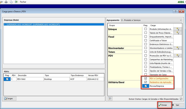 Processos> PDV > Área de Venda > Carga – Derevo | PDV e envie carga dos itens: