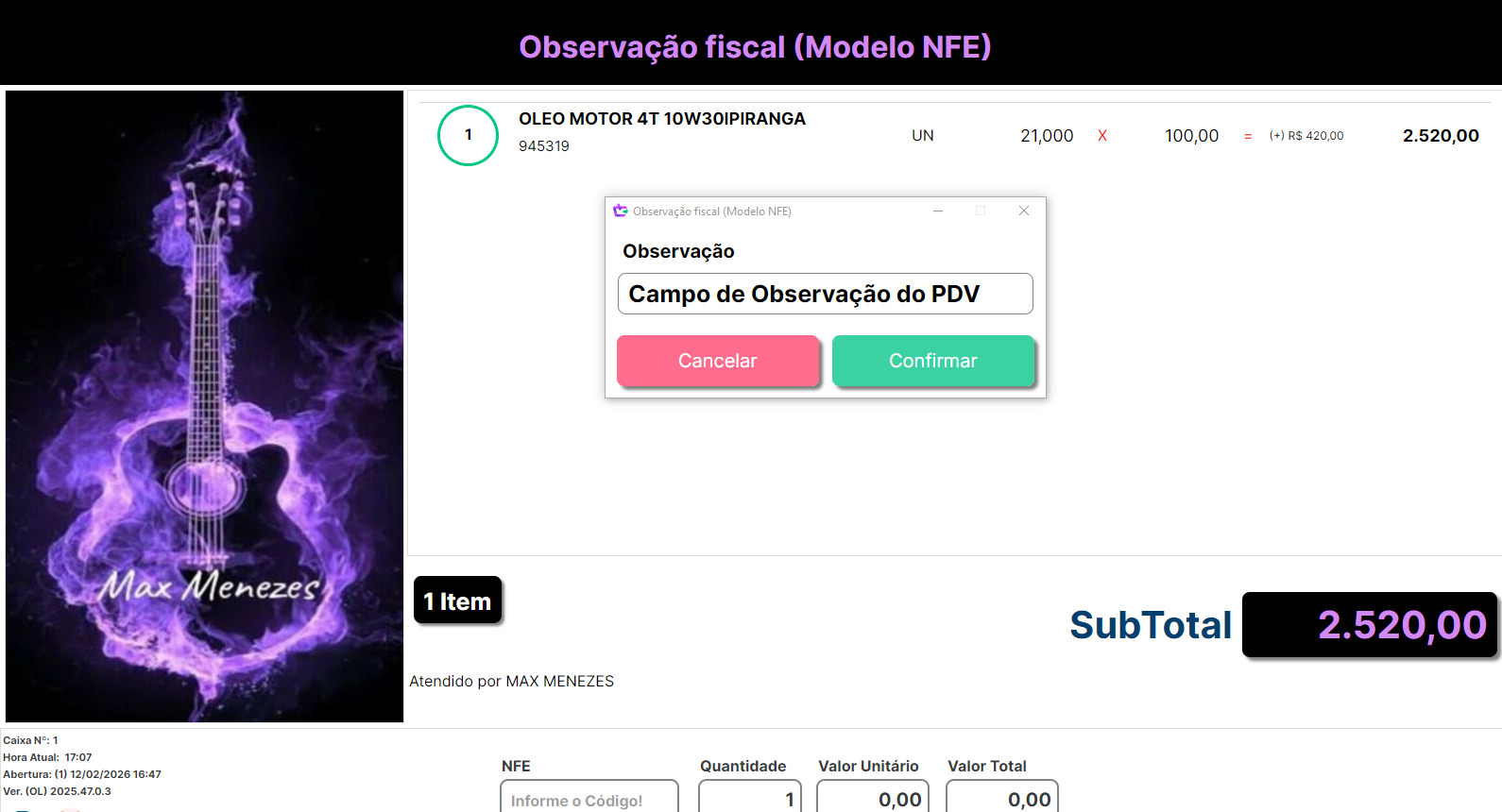 Quando ela escolher para finalizar em NFE, abre essa tela para informações das observações da NFE