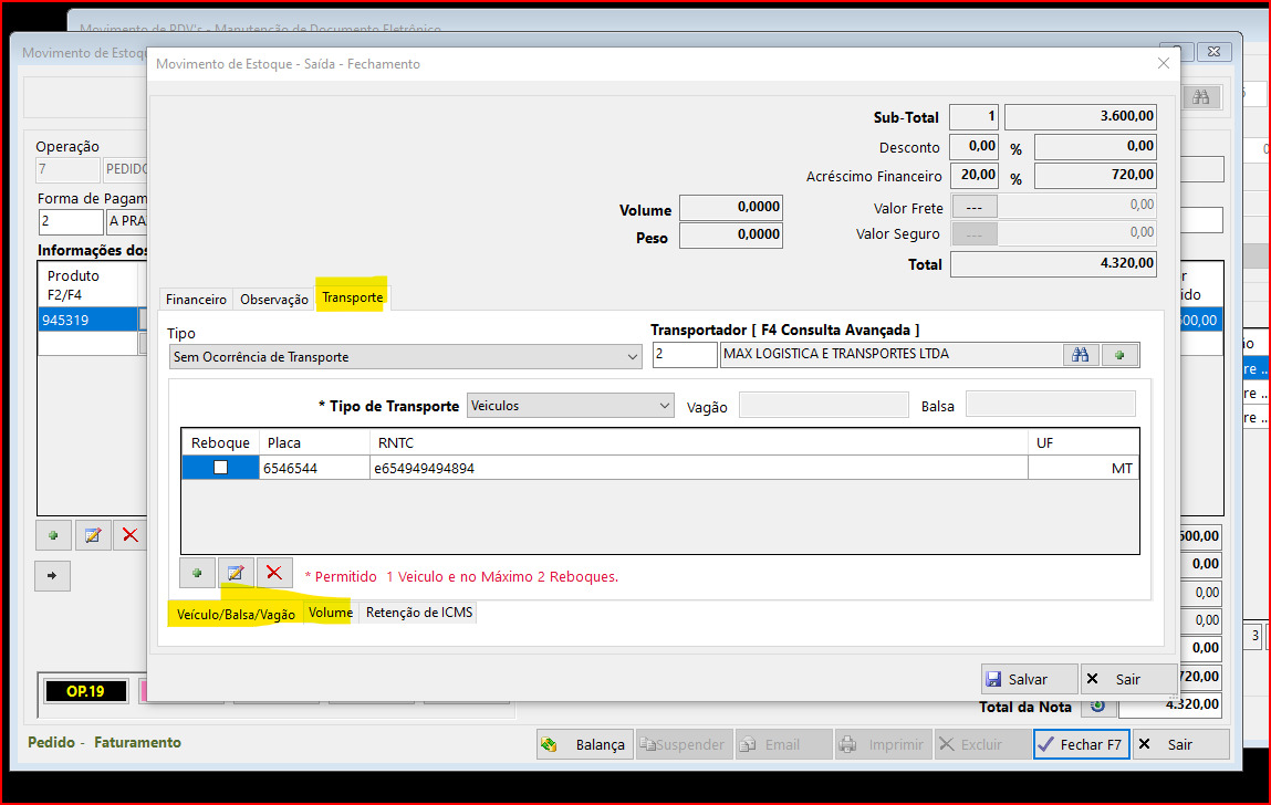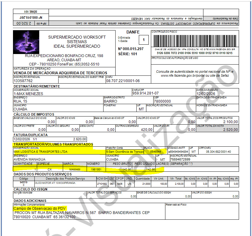 Observem os dados que saem na NFE: Transportador (que foi inserido lá no pedido do Gestor) e as observações, que foi inserido no PDV.