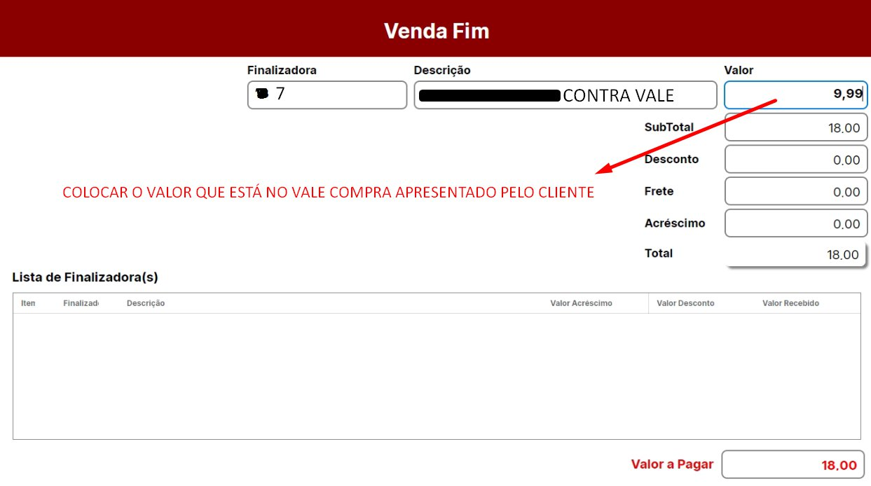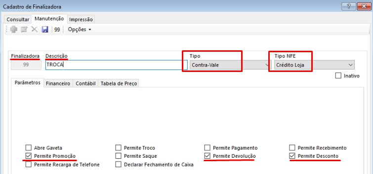• Ao finalizar uma venda o cliente vai apresentar o vale compra e a operadora vai utilizar a finalizadora especifica para essa operação (FINALIZADORA *99 TROCA*)